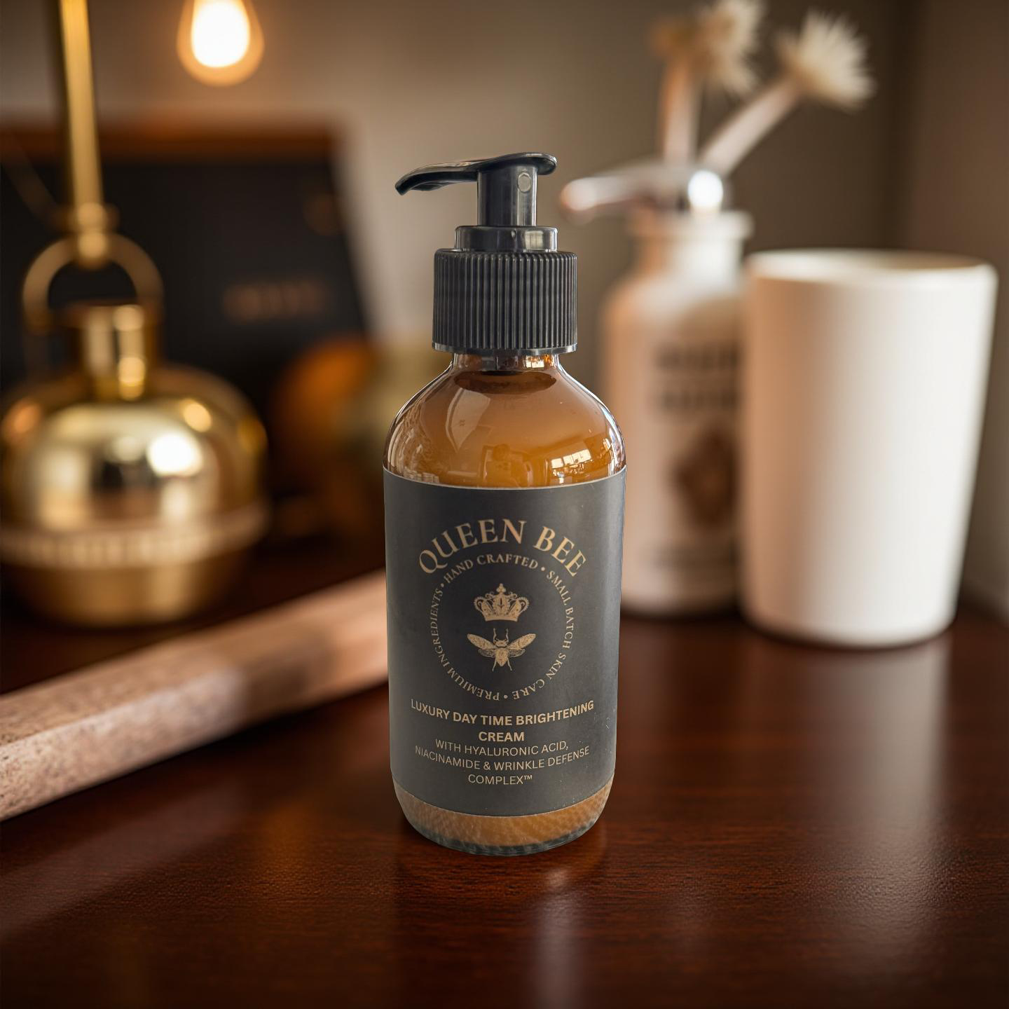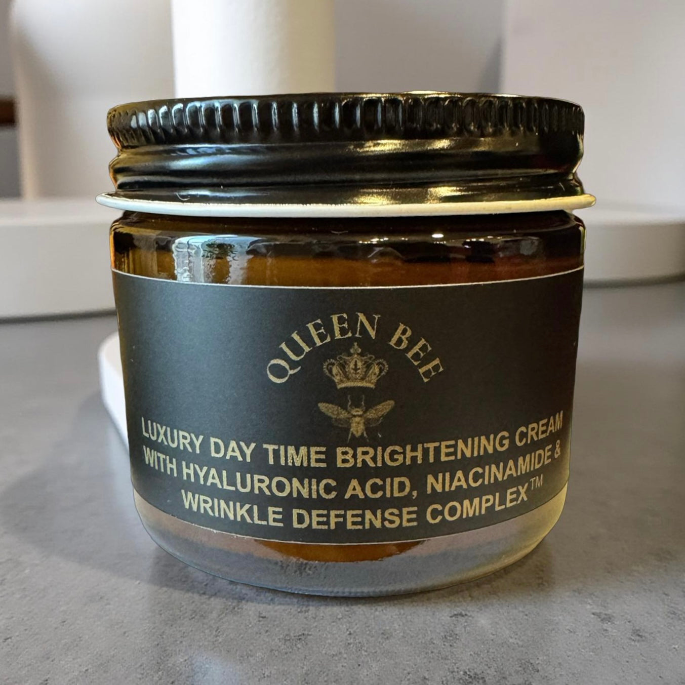 Queen Bee Beauty Luxury Daytime Brightening Cream delivers a sophisticated blend of powerful natural ingredients that unveil a smoother, more luminous complexion...all in a light, fast-absorbing formula perfect for daytime wear.